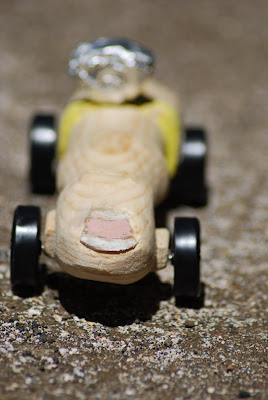 Benjamin decided on a less traditional design -- he wanted a finger. Helen, with an ego-crushing lack of confidence in my wood-carving skills, feared that the car would end up looking like another finger-shaped appendage, so we added a diamond ring to avoid any confusion.