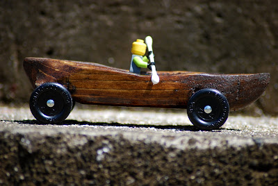 The pinewood derby has come around again, that time honored tradition of encouraging eight year olds to use saws, hammers, and power tools with finger severing potential. I respect the cub scout program, but come on; do you really expect responsible parents to allow their children to make these things themselves? So, like the rest of the dads in the ward, I was up late hacking and sawing at blocks of knotty pine, trying to fashion something that would meet my children's elaborately imagined designs. This year Matthew went with a local theme and requested a canoe. We wanted an authentic outrigger, but couldn't make it work and still fit on the track. Here are the results, complete with q-tip paddle.